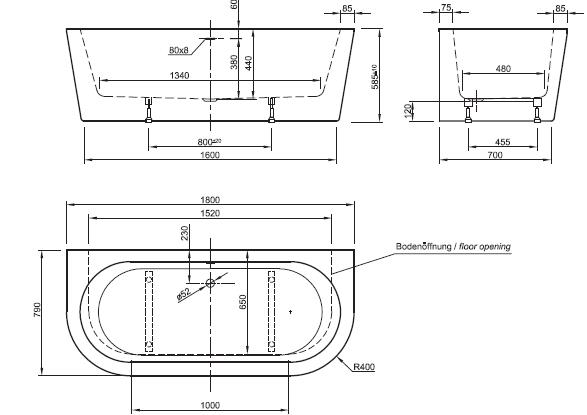 Properties "Charley 180x80x60 half-vrijst. bad glans wit incl. sleuf overloop/afvoer glans wit"