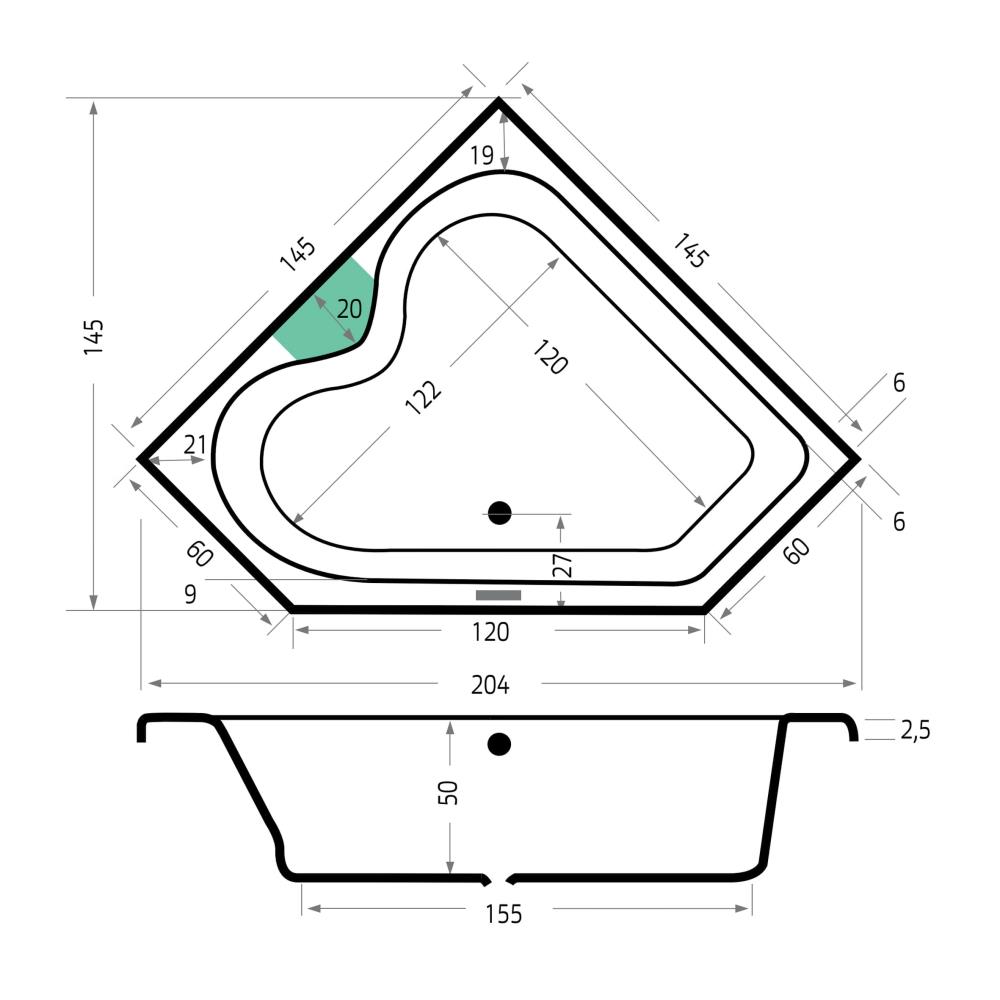Inbouwbad Cyprus van Xenz is een tweepersoons hoekbad en heeft een inhoud van maar liefst 420 liter. Door de vormgeving is het geen doorsnee duobad. Dit hartvormige bad biedt namelijk de mogelijkheid om naast elkaar te liggen in plaats van tegenover elkaar. Dankzij de twee ingebouwde ligplaatsen kunnen beide personen van een comfortabele ligpositie genieten.