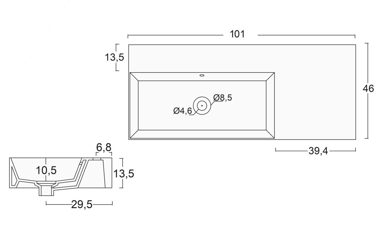 Properties "Dolce Plan keramisch wastafelblad, wegzetvlak rechts. 101x46 Wit mat"