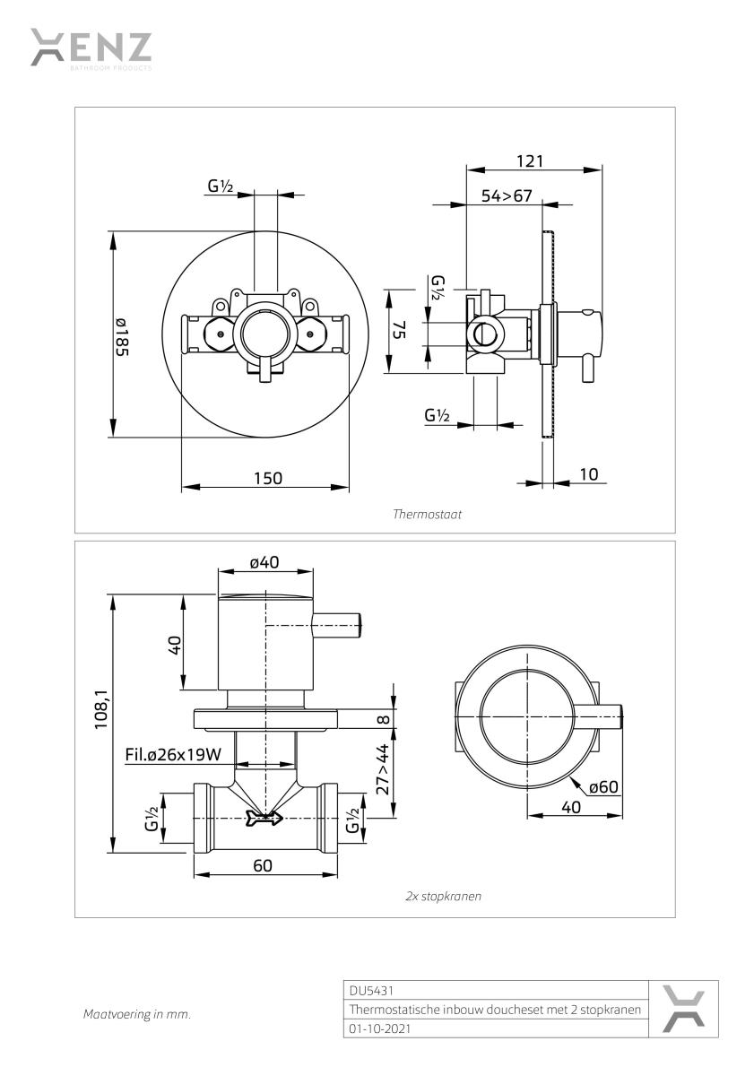 Duero douche inbouwset (thermostatisch), met 2 stopkranen, inox