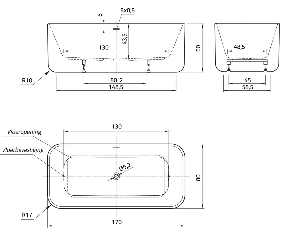 Fenna 170x80x60 vrijstaand bad glans wit incl. sleuf overloop/afvoer glans wit