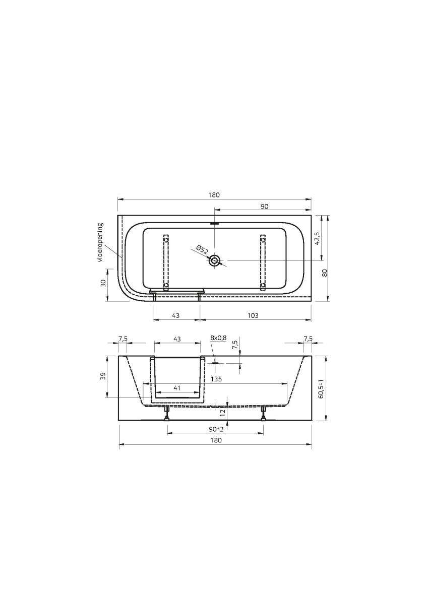 GO! inloop douchebad 180 x 80 cm rechts wit incl. luxe sleuf overloop en waste in wit.