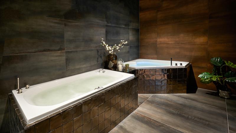Door dit bad met stoere zwarte kranen te combineren, wordt een industriële look gecreëerd. Gouden kranen zorgen voor een luxe uitstraling en RVS-kranen zorgen voor een rustig en minimalistisch uiterlijk.