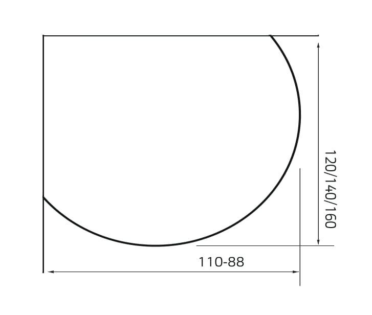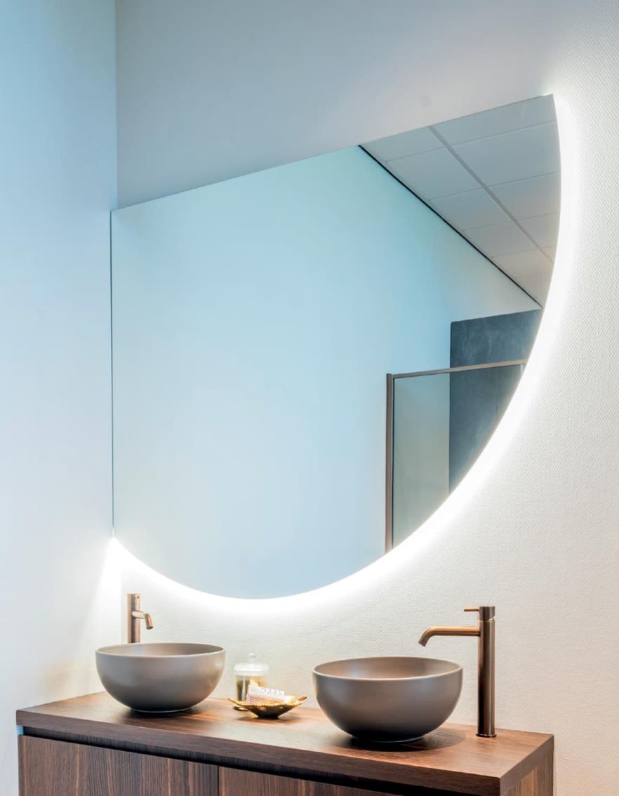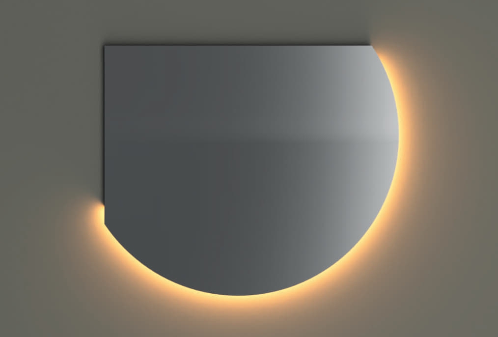 Quartoluna spiegel 120x110, indirecte verlichting ronde kant, vlakke zijde links tegen plafond