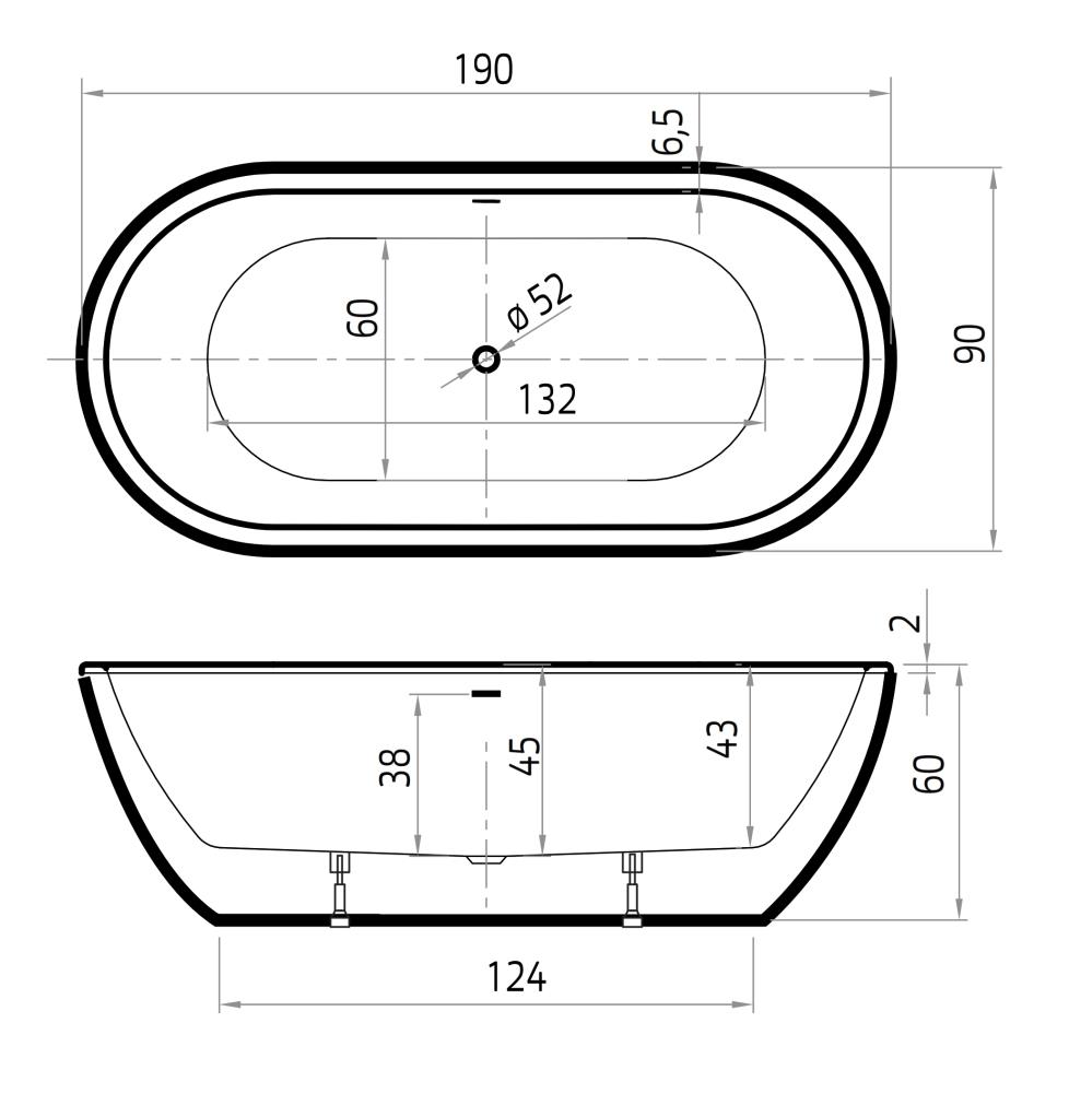 Rens 190x90x60 vrijstaand bad mat wit incl. sleuf overloop/afvoer mat wit