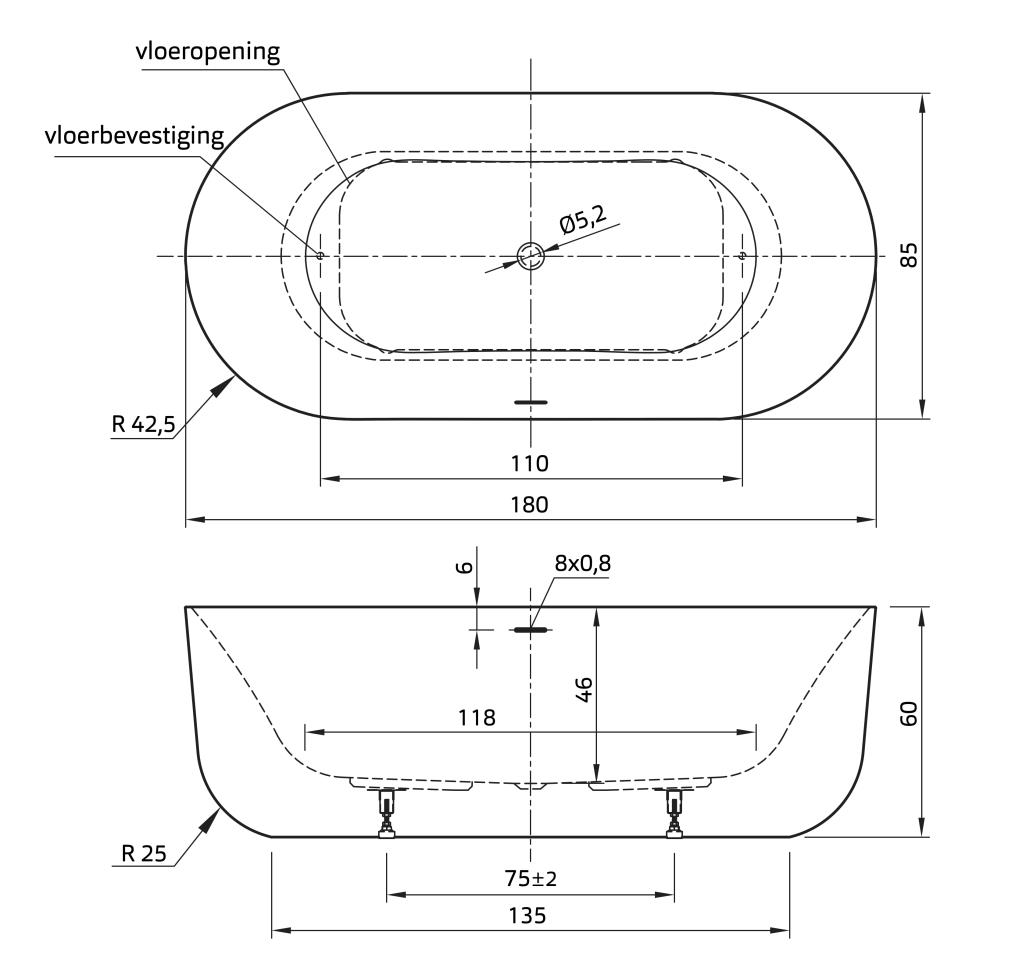 De badafvoer bevindt zich in het midden. Vrijstaand bad Sanne is verkrijgbaar in Wit en Edelweiss. Het bad is ook in een groter formaat verkrijgbaar.