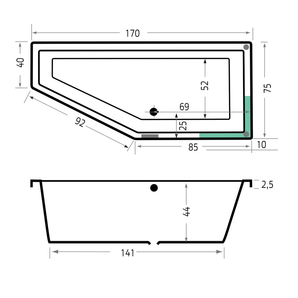 - 170x75x44 cm, inclusief badpoten. (LxBxD)
