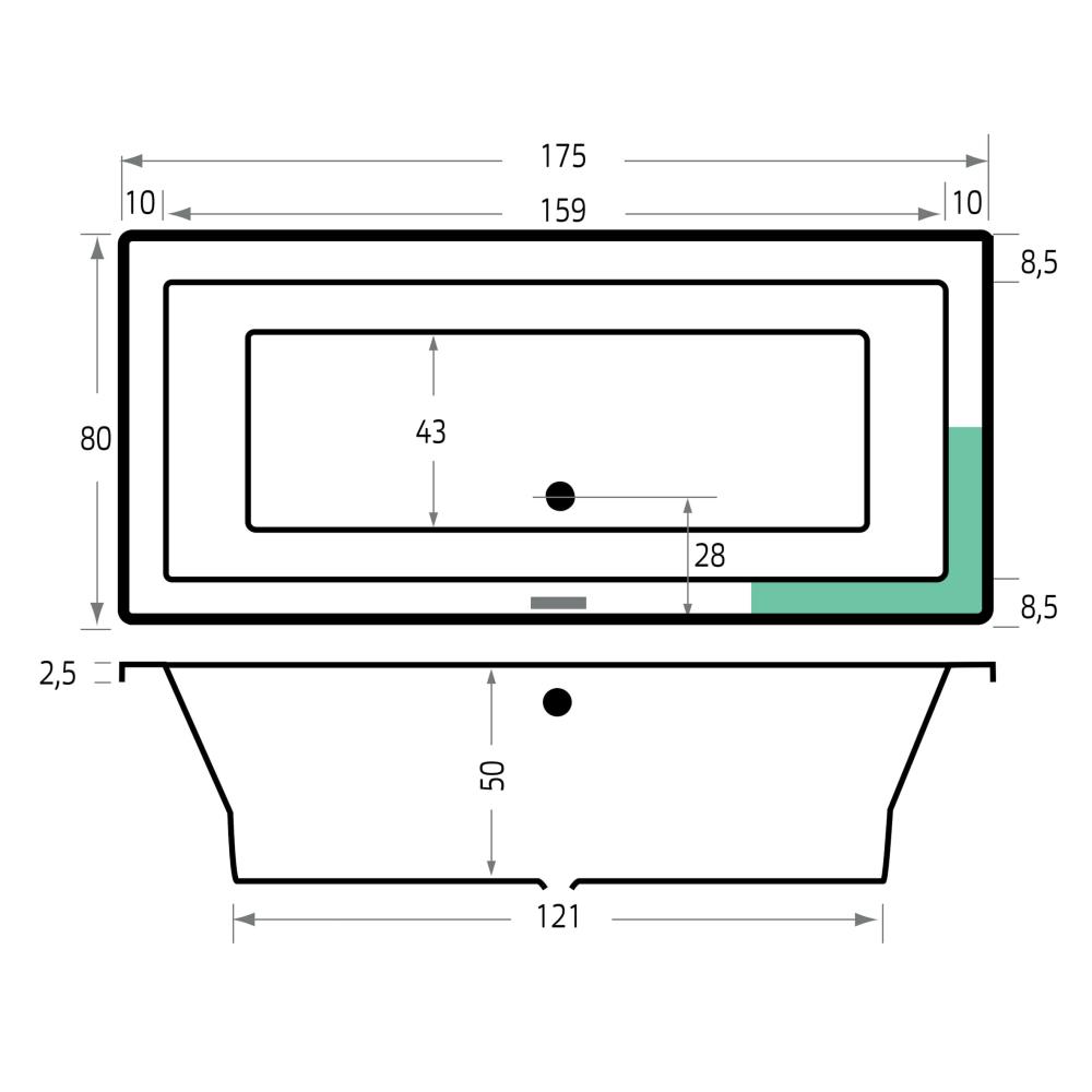 - 175x80x50 cm, inclusief badpoten. (LxBxD)