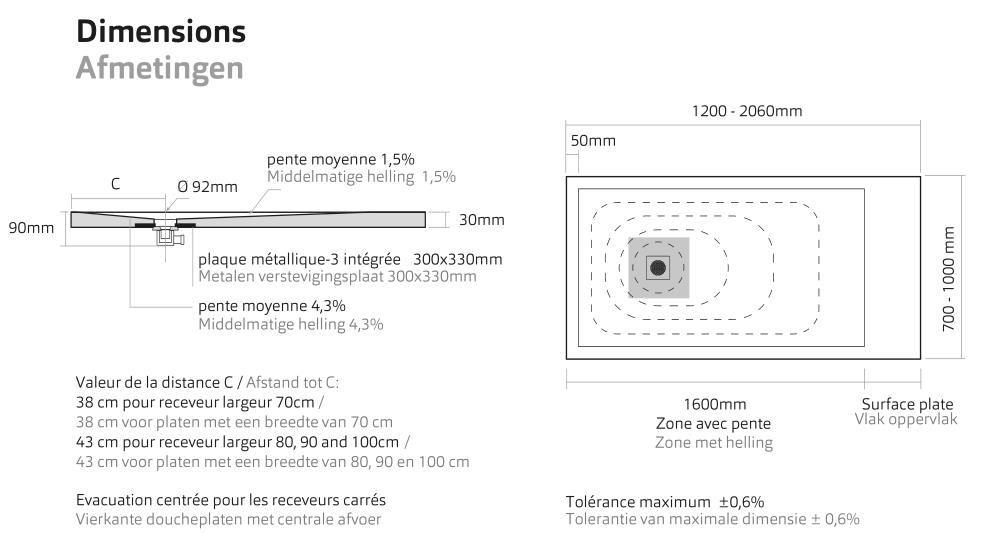 Properties "Soft douchevloer 120x80x3, rvs square drain, cement"